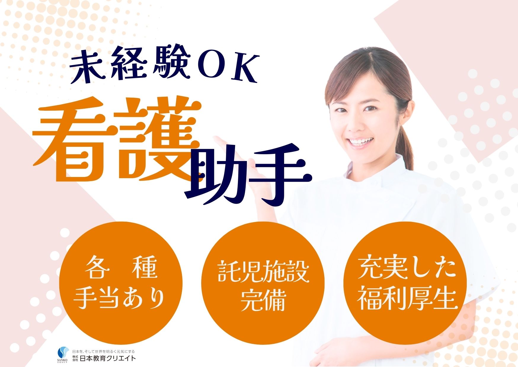 三幸福祉カレッジを運営する(株)日本教育クリエイトの介護職専門就職アドバイザーが、お仕事決定までトータルサポート。