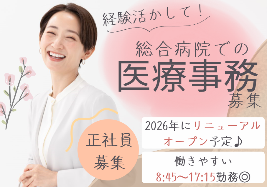 【医療事務の経験があれば応募OK☆】賞与3ヶ月分+福利厚生充実/経験を活かせる医療事務☆新病院リニューアル予定あり!