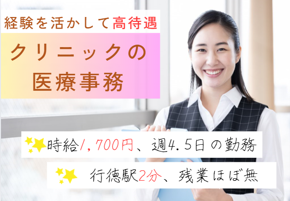 【行徳駅徒歩2分/臨時派遣】経験を活かして高時給1700円◎週休2日&年休120日以上で無理なく働ける医療事務