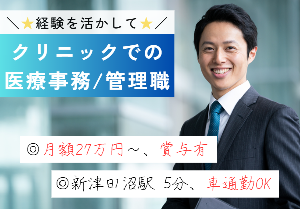 【津田沼駅徒歩5分】賞与3.4ヶ月*経験活かせる医療事務・管理職募集/40代活躍中・正社員