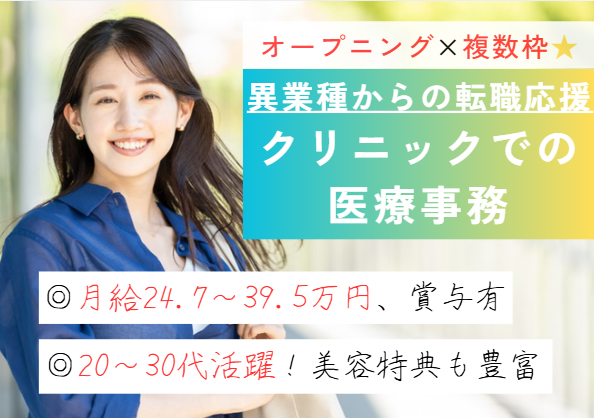 \オープニングスタッフ募集☆同世代と一緒にゼロから始める安心のお仕事♪/クリニックならではの美容特典もあり◎未経験から正社員へ!月給24.7万円~39.5万円も目指せます♪