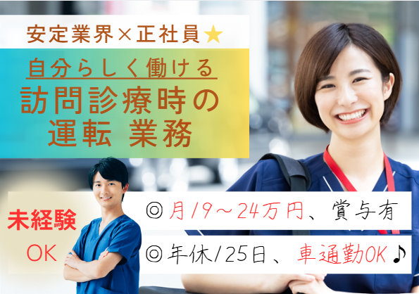 \訪問診療の送迎ドライバー募集中☆/車の運転に自信がある方におすすめ◎安心の正社員で月給19万円~24万円!休日もしっかり確保でライフバランスもOK★