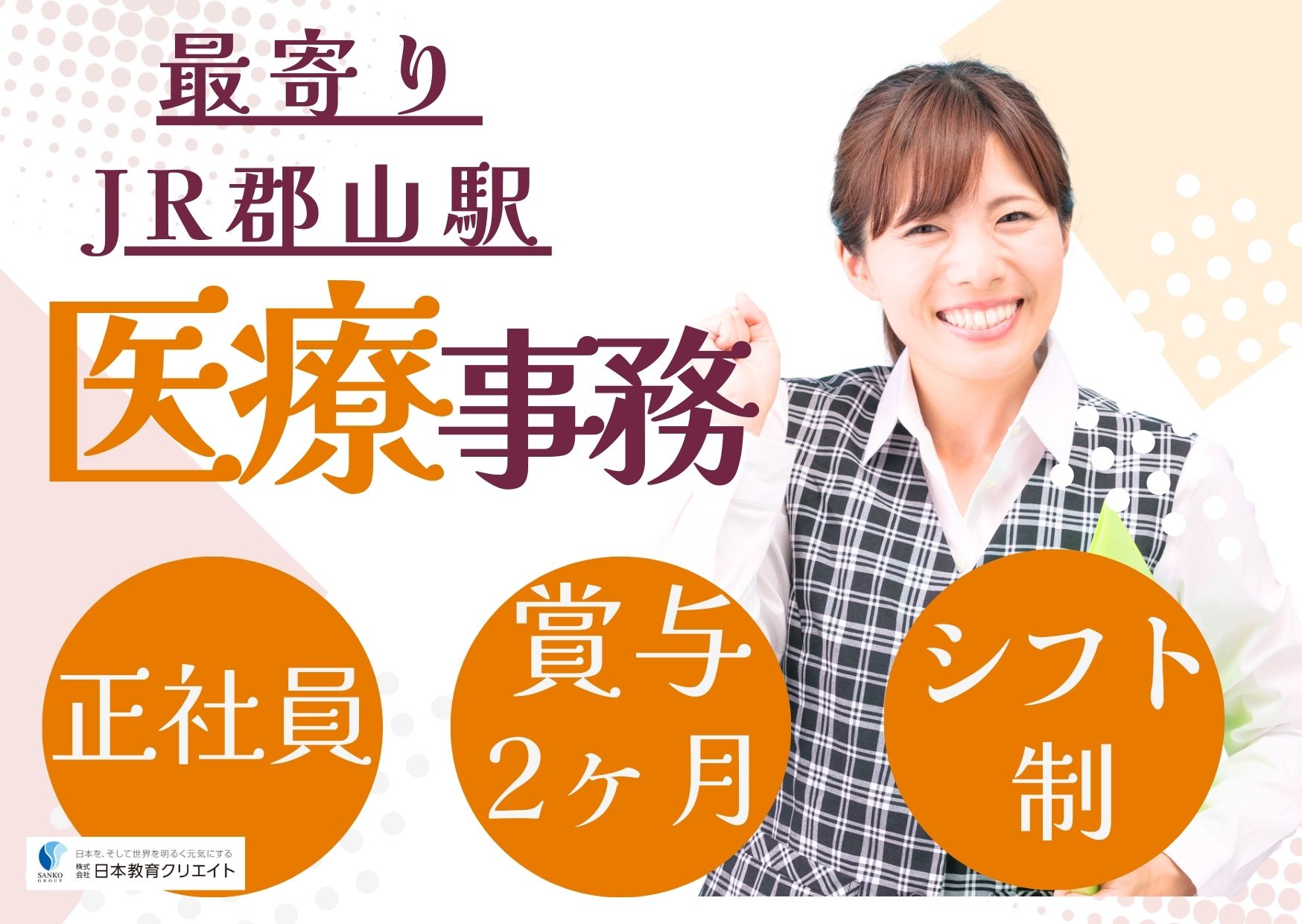 【郡山駅車5分・無料駐車場あり】経験を活かして働けるクリニック事務*月9日休/賞与・各種手当充実◎