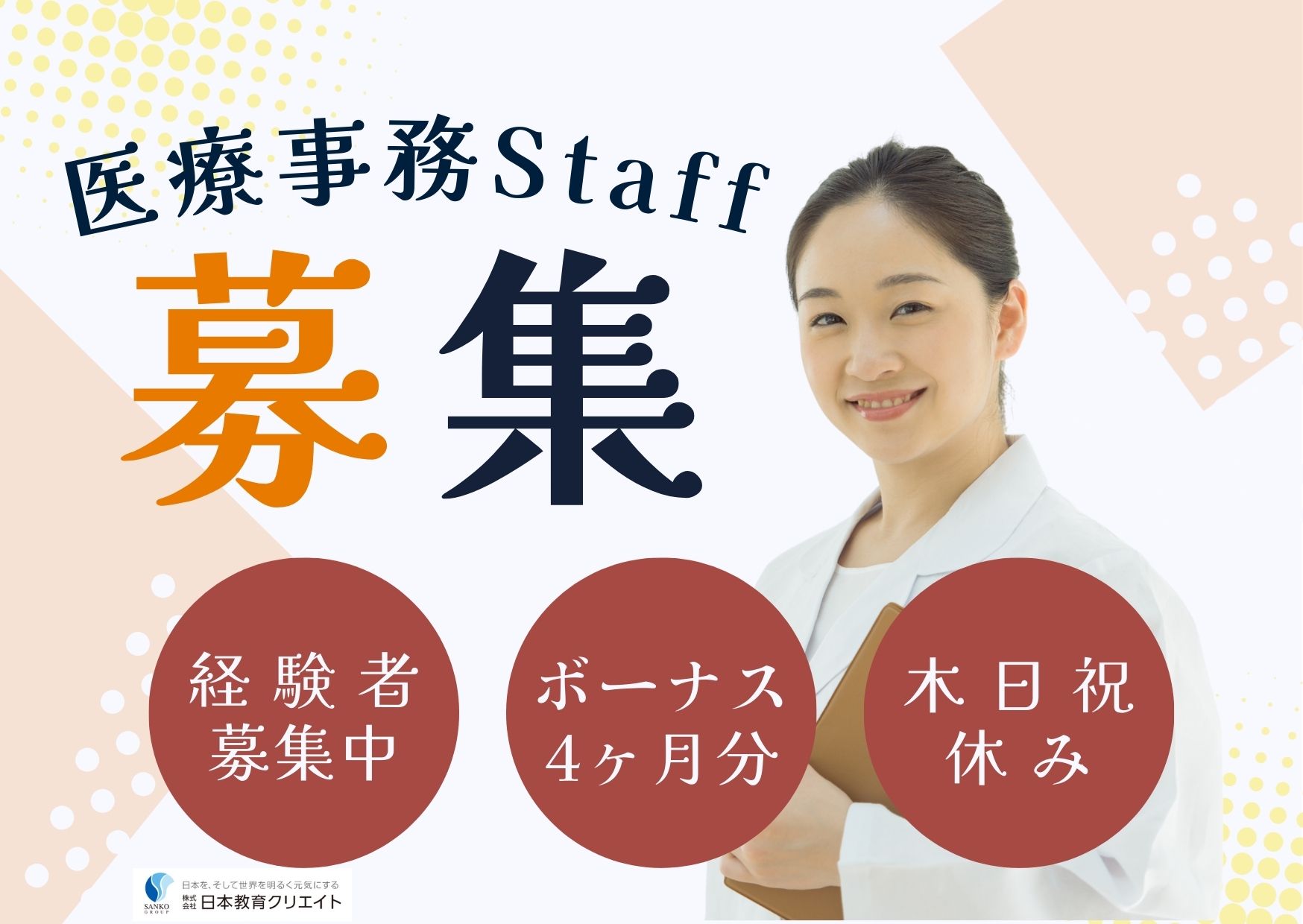 医療事務求人ドットコムは、医療・介護・IT分野に特化した人材・教育サービスを手掛ける株式会社日本教育クリエイトが運営する求人サイトです。創業から約40年、全国の拠点ネットワークを活かし、これまでに累計47万人※以上の求職者を支援してきた実績があります。