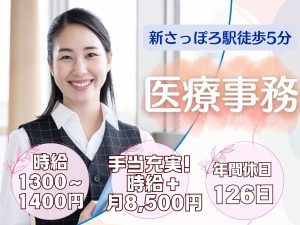 【札幌市厚別区・新さっぽろ駅5分】時給1,300円~1,400円/医療事務経験者募集/年間休日126日/新札幌循環器病院/派遣