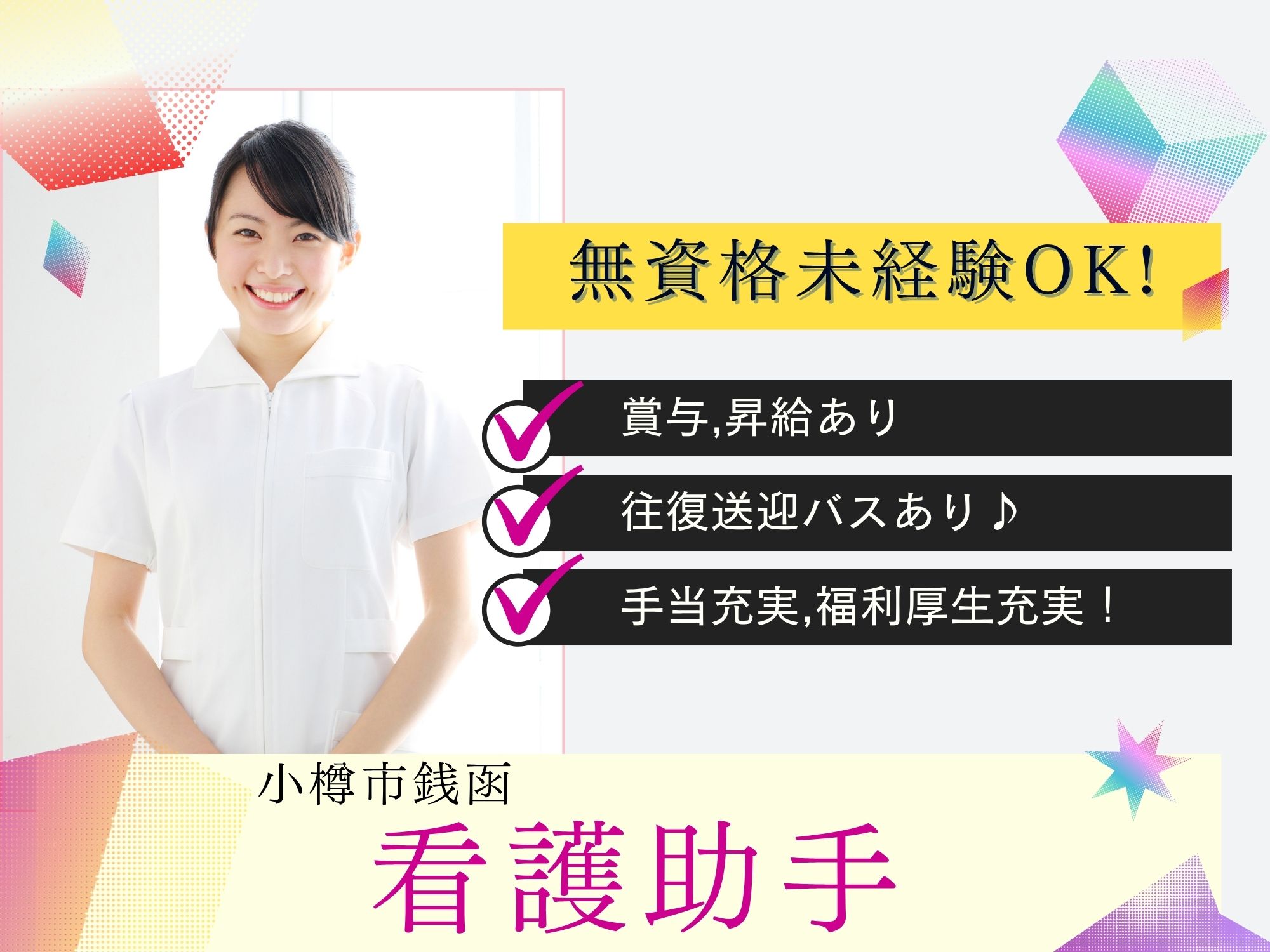 【JR朝里駅から徒歩15分】資格必須!未経験OK!月給156,500円/賞与3.2ヵ月/昇給あり◎土日祝お休み/残業無し/教育体制しっかり/マイカー通勤可能/駐車場代無料