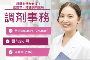 【函館市・桔梗調剤薬局】経験必須!月給180,000円~275,000円/賞与3ヶ月/年休120日/マイカー通勤可/無料駐車場あり/ファーマライズ株式会社 桔梗調剤薬局/調剤事務