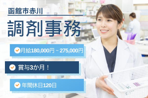 【函館市赤川・調剤薬局】経験必須!月給180,000円~275,000円/賞与3ヶ月/週2日お休み/年休120日/ファーマライズ薬局赤川店/調剤事務