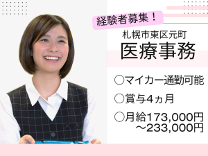 【札幌市東区・元町駅】月給173,000~233,000円/経験者募集/賞与4ヵ月/福利厚生充実/医療事務/豊生会元町総合クリニック
