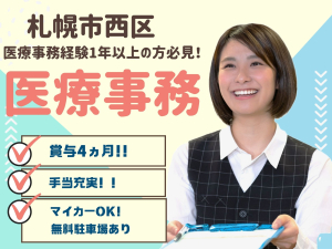 【札幌市西区/無料駐車場あり】医療事務経験1年以上の方チャンスです★月給18.2万~21.0万円+賞与4.5ヶ月!日勤のみでワークライフバランスも◎