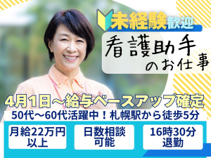 【札幌駅から徒歩5分】4月1日~ベースアップ確定!月収22万以上◎時給1,250円/日勤のみ/16時半退勤/日数相談可能/斗南病院/看護助手