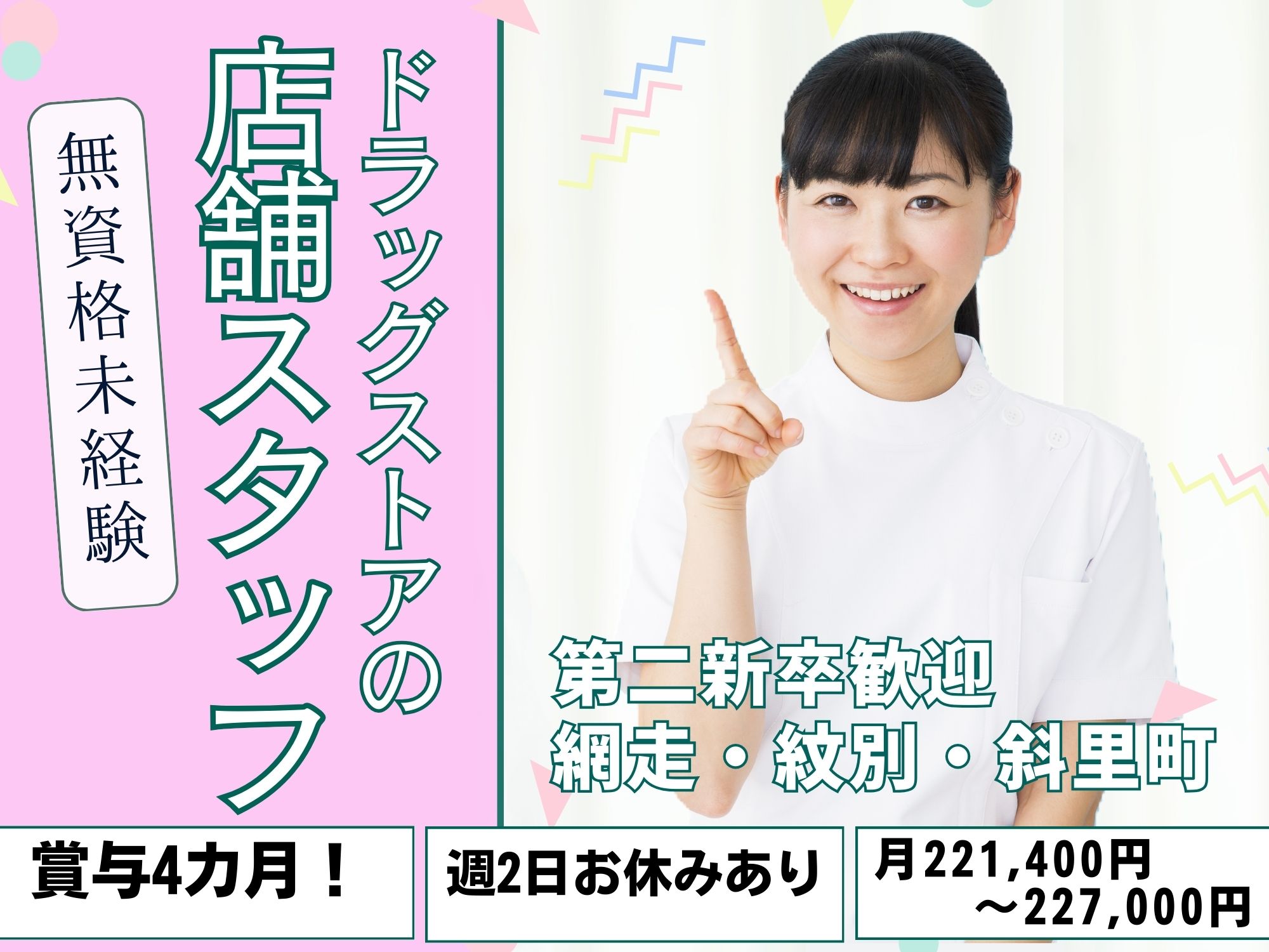 【サッポロドラッグストアのお仕事!オホーツクエリア】無資格未経験OK!第二新卒の方もポテンシャルを評価!月給221,400円~227,000円/週2日お休みあり◎賞与4カ月,昇給あり!