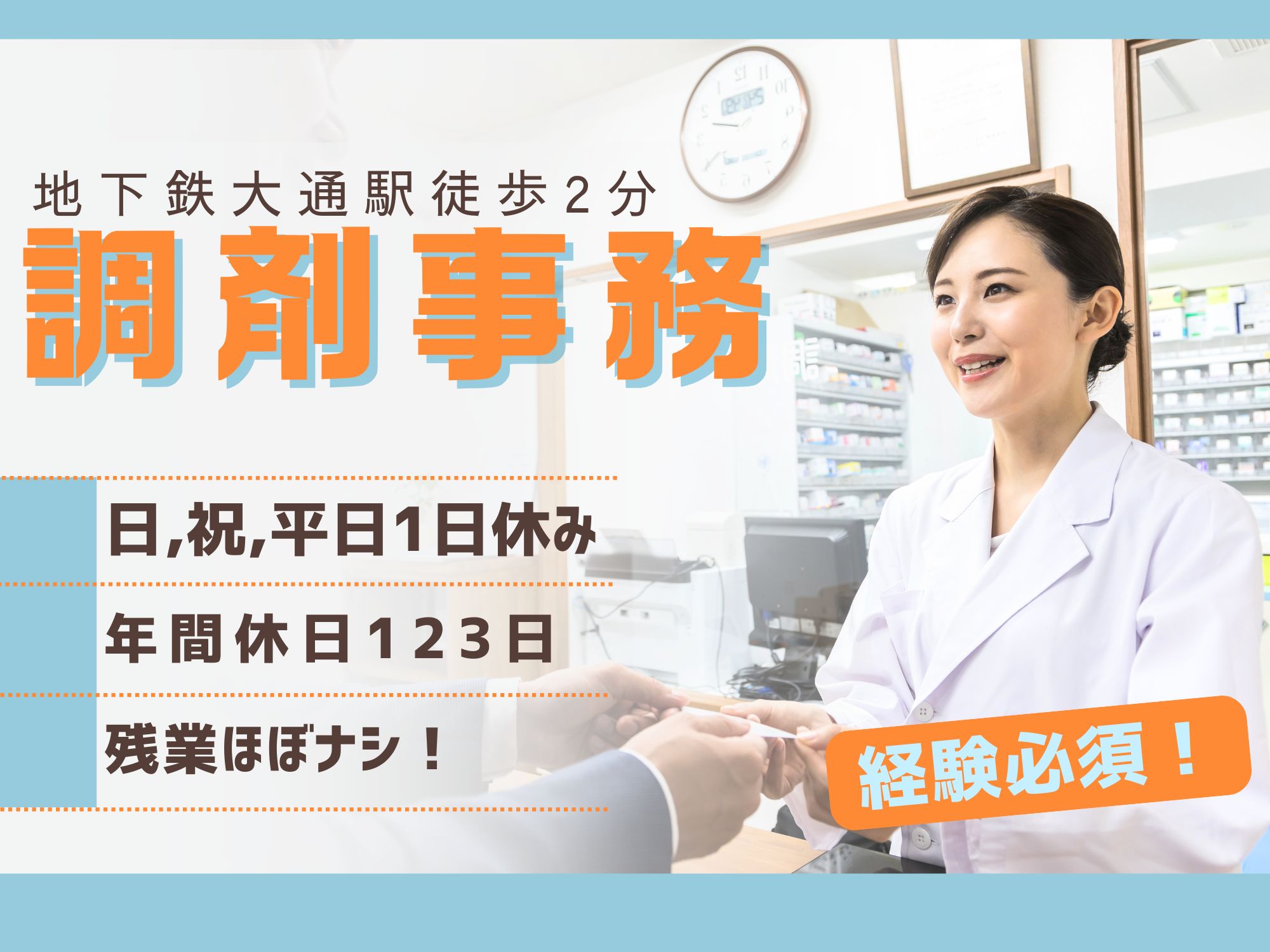 【地下鉄大通駅徒歩2分】経験必須!残業ほぼナシ!月給17万~23万円/年間休日123日/調剤薬局事務/日之出ビルにある日之出調剤薬局