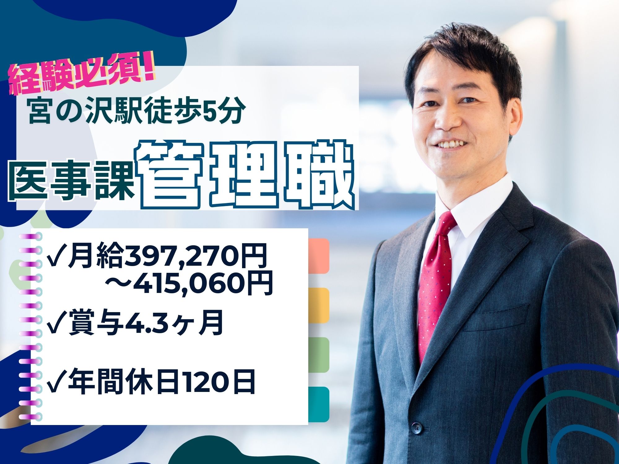 【札幌市西区・宮の沢駅徒歩5分】経験必須!月給397,270円~415,060円/賞与4.3ヶ月/年間休日120日!医療事務管理職/正社員/札幌孝仁会記念病院