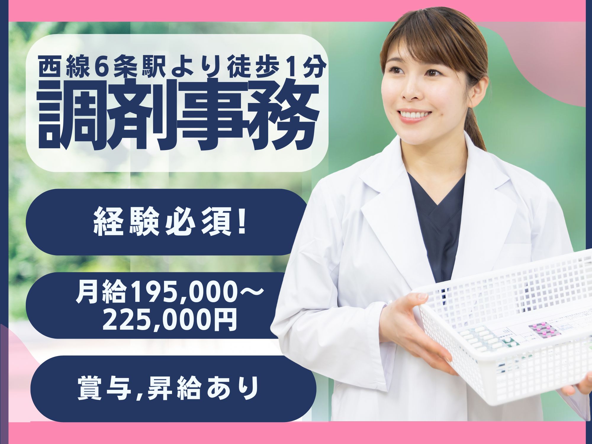 【西線6条駅より徒歩1分】レセプト請求業務の経験必須!月給195,000~225,000円/賞与,昇給あり/年末年始休暇あり♪調剤事務/プラム薬局 配薬調剤センター