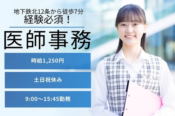 【札幌市北区・北12条駅徒歩7分】時給1,250円/週5日・土日祝休み/経験必須!医師事務作業補助【地下鉄北12条駅徒歩7分】子育て世代応援◎15:45までの時短勤務/時給1,250円/土日祝休み・年休126日/無資格未経験OK/北海道大学病院/皮膚科病棟/医師事務/北海道大学病院
