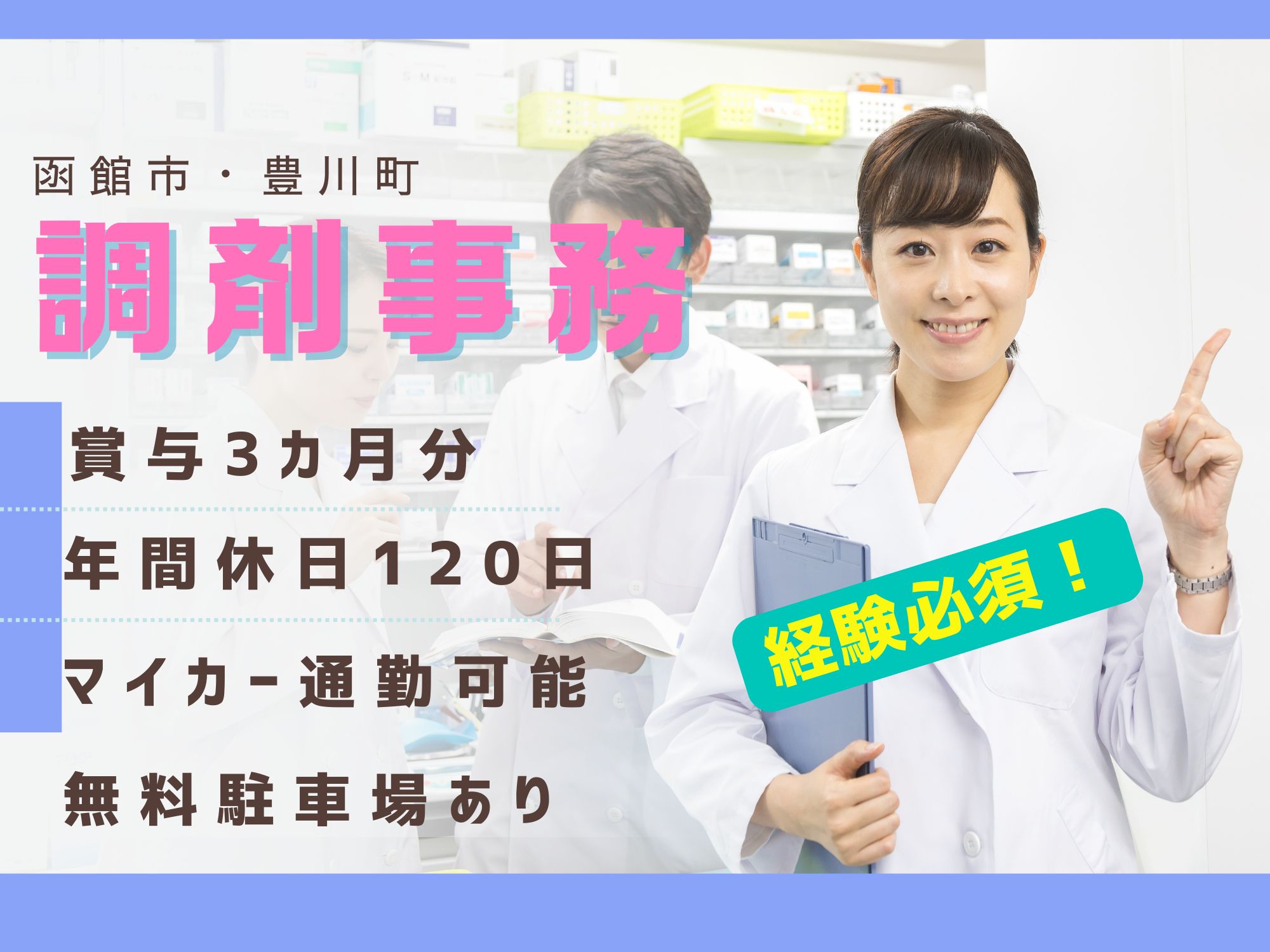 【函館市・十字街エリア】調剤事務経験者歓迎/正社員/賞与3ヶ月×年休120日/福利厚生充実&残業ほぼなし!