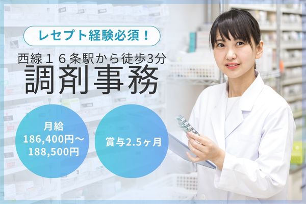 【西線16条駅から徒歩3分】レセプト経験必須!月給186,400円〜188,500円/賞与2.5ヶ月/日祝固定休み/調剤事務/はなぶさ調剤薬局 山鼻店