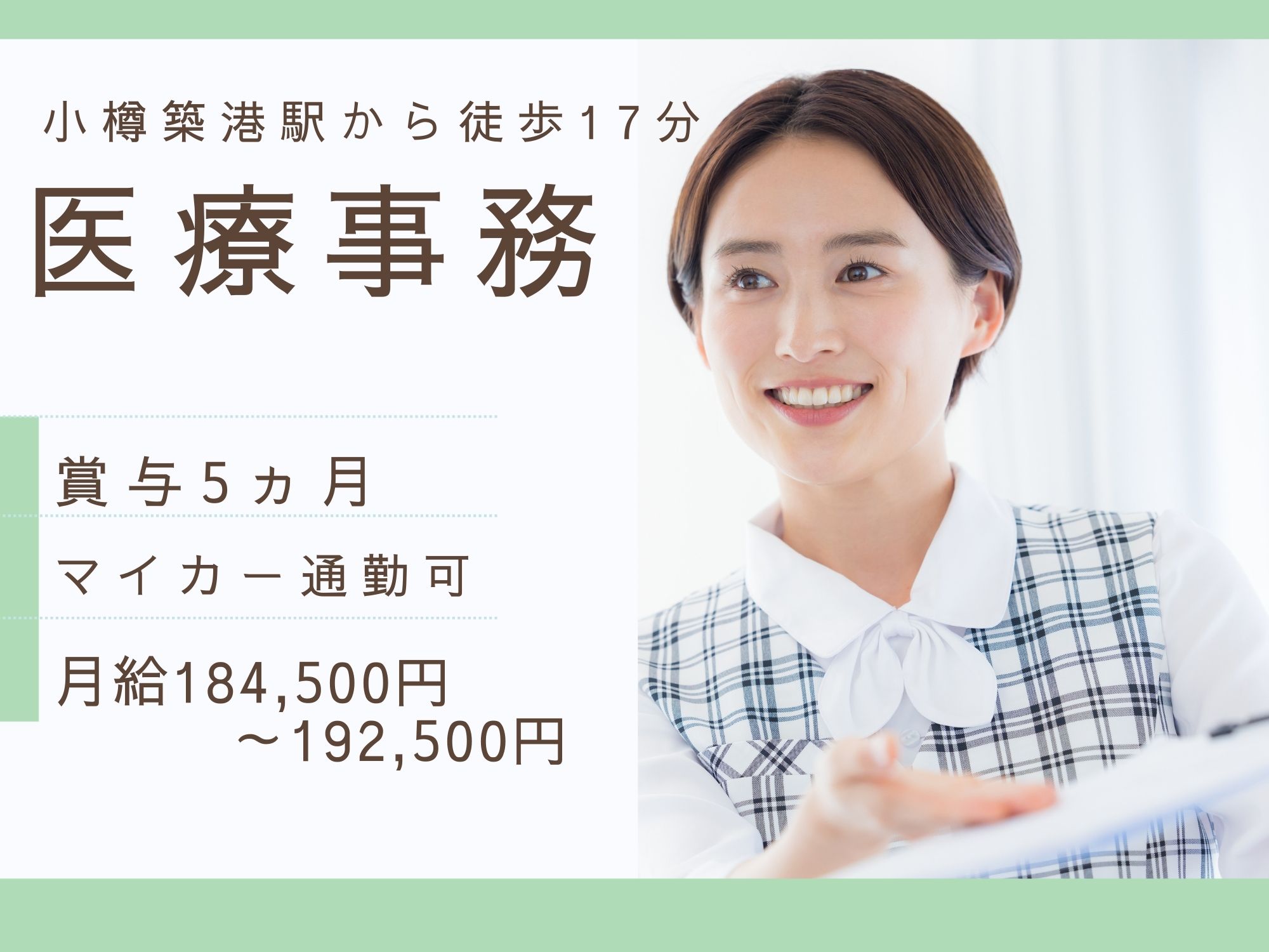 【小樽築港駅から徒歩17分】医療事務経験者求人/月給184,500円~192,500円/賞与5ヶ月分/マイカー通勤可/花園内科クリニック/医療事務