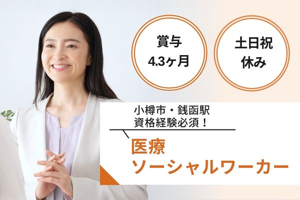 【小樽市・銭函駅】資格経験必須!月給188,000円~249,200円/賞与4.3ヶ月/土日祝休み/年間休日120日/病院での社会福祉士/医療法人ひまわり会札樽病院