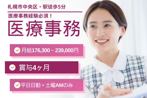【札幌市中央区】地下鉄から徒歩10分以内/医療事務経験者歓迎!賞与年2回・福利厚生充実の安定正社員