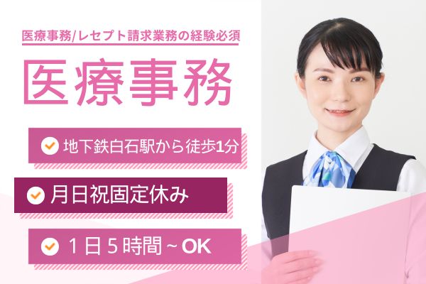 【白石駅徒歩1分】実働5~8h相談OK◎経験者歓迎!資格不問の医療事務/週3日~&残業少なめ・日祝休みでプライベートも充実