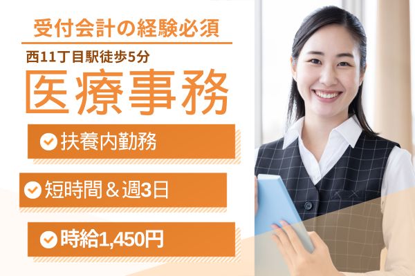 【札幌市中央区/駅チカ】扶養内勤務|脳内科クリニックの医療事務|短時間・週3日・扶養枠OK◎働き方相談可!