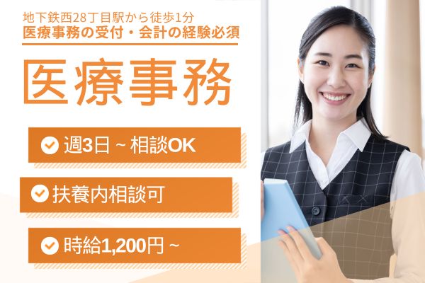 【西28丁目駅から徒歩1分】医療事務の受付&会計経験を活かす|週3日~扶養内OK◎時給1200円|小児科クリニックで医療事務スタッフ募集!