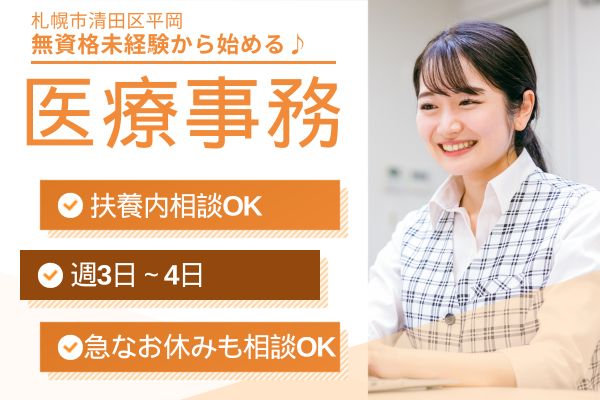 【札幌市清田区】半日勤務も可◎未経験歓迎!子育て世代も活躍中*週3日~OKの医療事務パート◆時給1200円+賞与あり