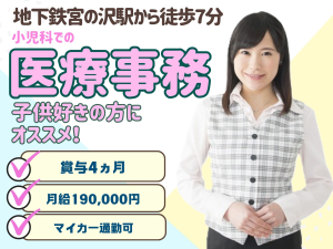 【地下鉄宮の沢駅から徒歩7分】医療事務経験必須!月給190,000円◎賞与4ヵ月/昇給あり!マイカー通勤可/無料駐車場完備/受付・医療事務/にこにこ小児科クリニック