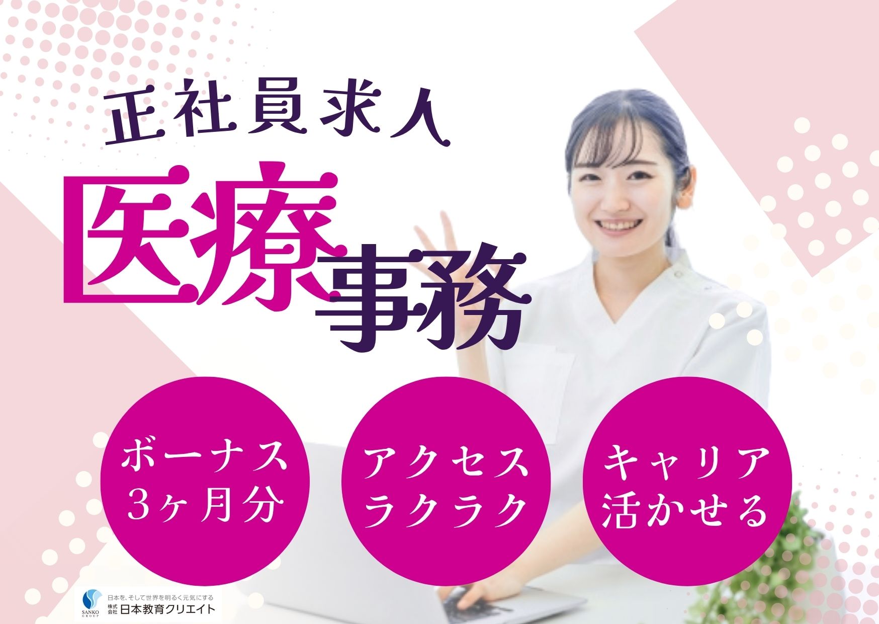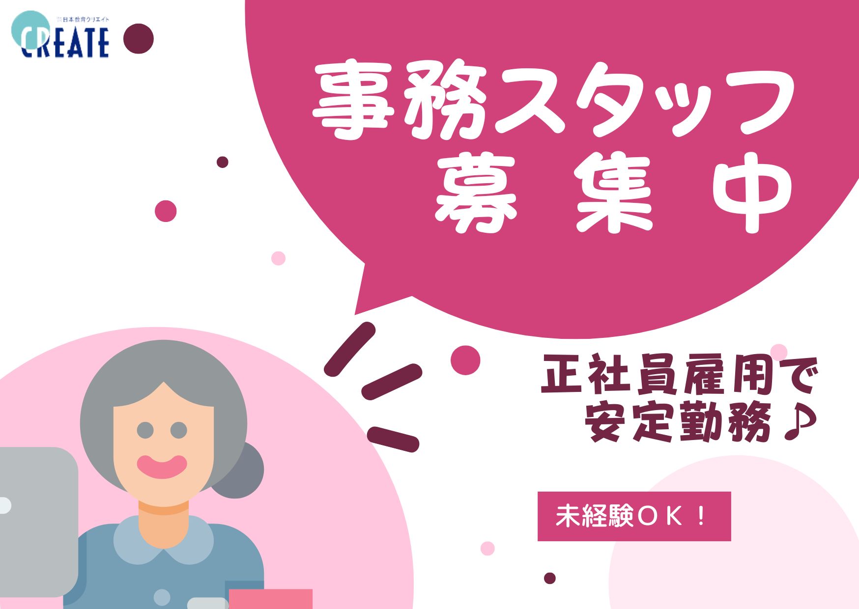 定時帰りしやすい・月9日休みでプライベートと両立OK・駅チカでアクセスラクラク・PCスキルなくてもOK