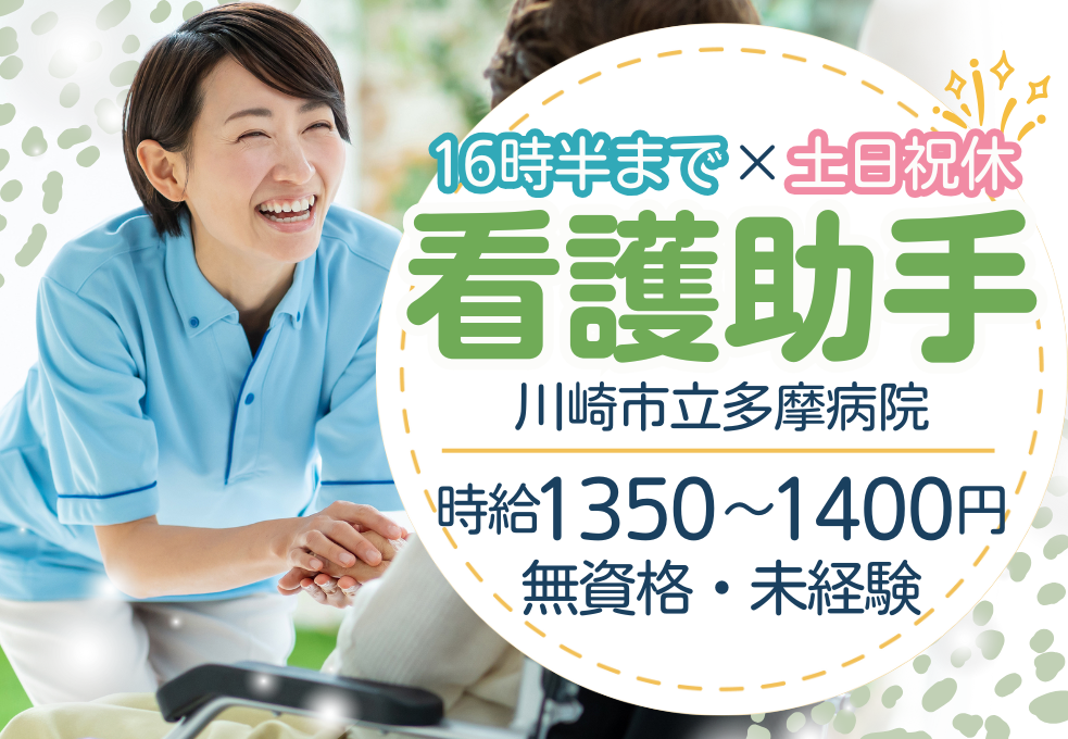 【登戸駅3分】病棟看護助手*\無資格・未経験者募集/*平日週5日×1350~1400円│土日祝休み|16:30定時◎残業ほぼなし|社会保険完備|交通費別途支給あり