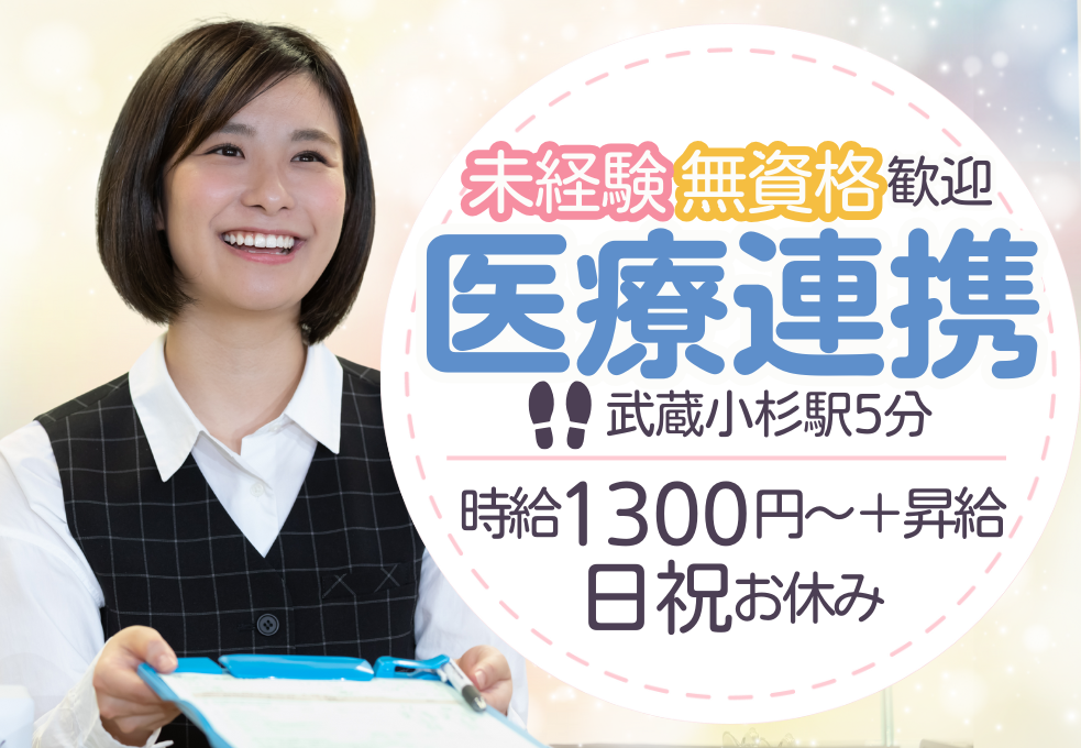 【武蔵小杉駅5分】地域医療連携室*\無資格・未経験者募集/*平日週5日×1300円~│日祝休み|17時定時◎残業ほぼなし|社会保険完備|交通費別途支給あり