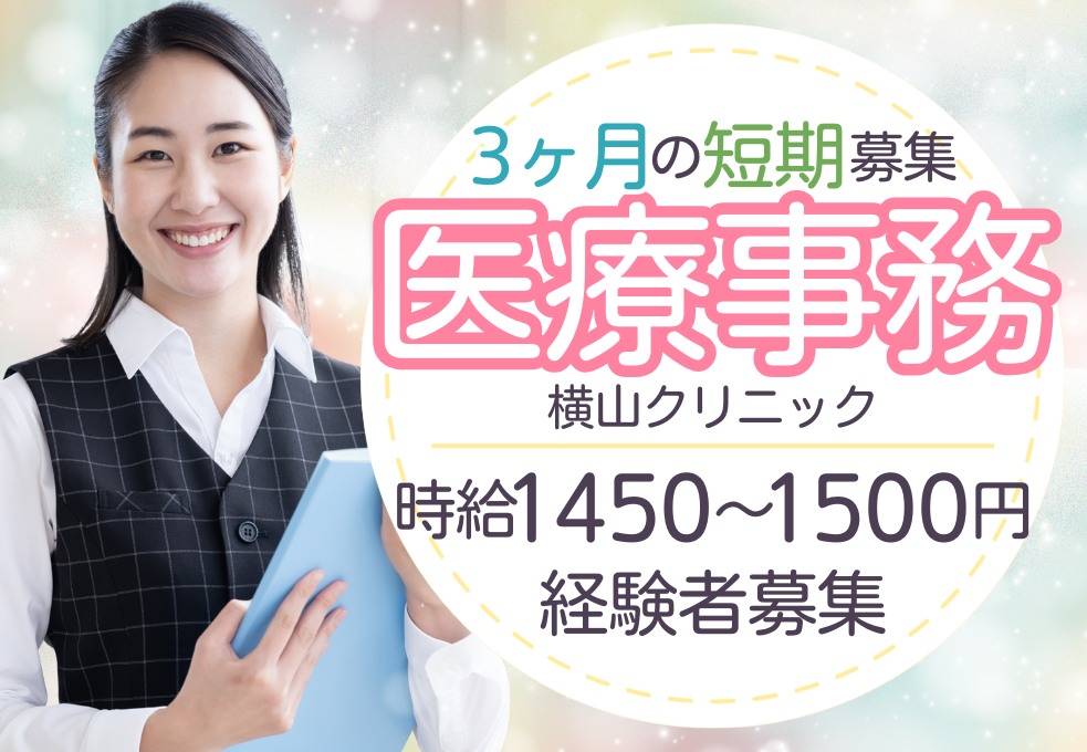 【横山クリニック】*\3ヶ月短期求人/*経験が活かせる医療事務◎時給1450~1500円|高時給&福利厚生充実◎40代50代スタッフ活躍中