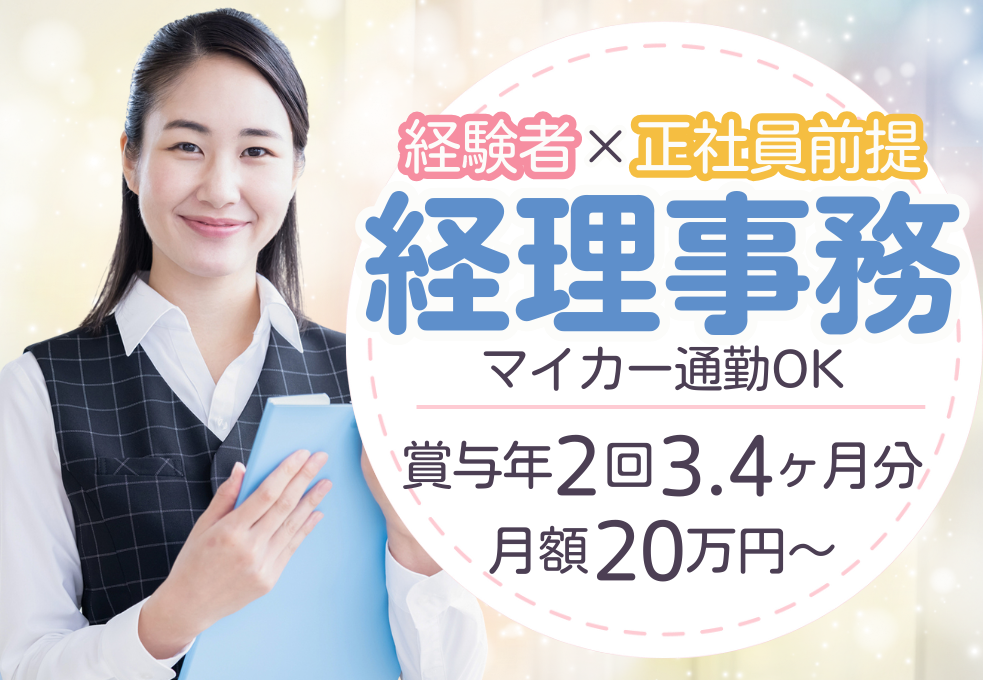 *\経理経験者必見/*月給20万円~+賞与年3.4ヶ月分|日祝休み|マイカー通勤OK&交通費別途支給|年末年始休暇あり