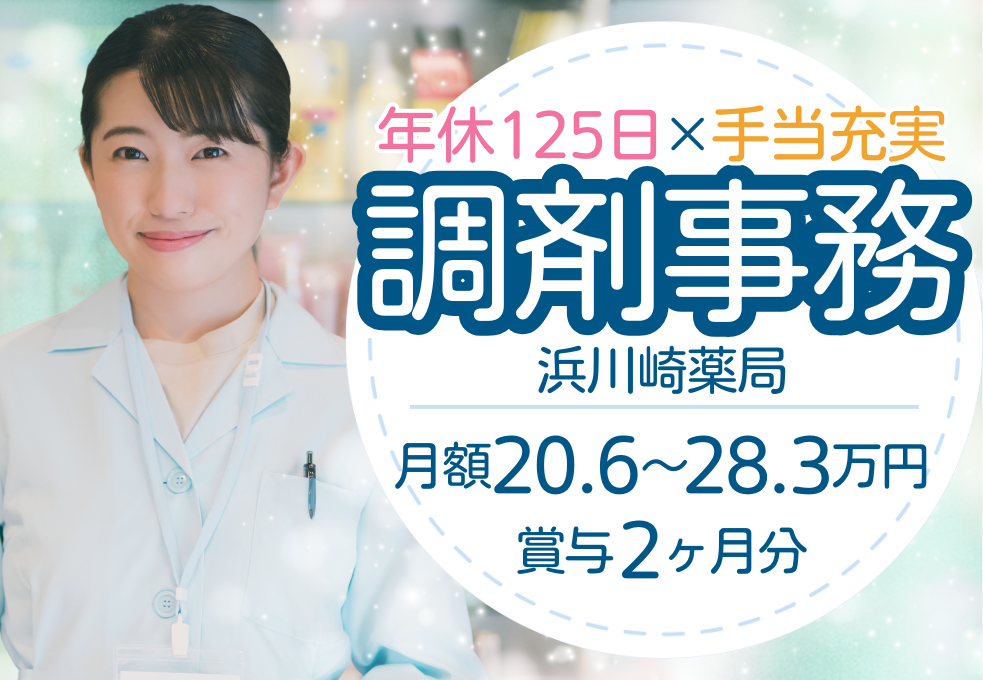 【小田栄駅8分】経験者募集*\正社員×月給20.6万円以上/*年休125日|調剤薬局での事務|賞与2ヶ月分|日祝休み|川崎市川崎区