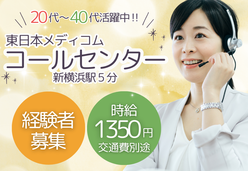 【新横浜駅5分】コールセンター*\経験者募集/*9:00~20:00勤務×週5日|時給1350円~|社会保険完備|交通費別途支給