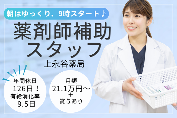 【上永谷薬局】9時スタートで働きやすい◎正社員・薬剤師補助スタッフ募集★有給消化率9.5日!仕事も、私生活も、どちらも大切に◎
