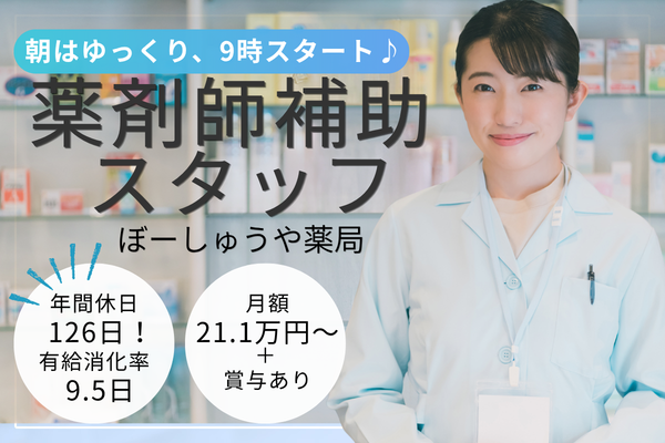 【ぼーしゅうや薬局】9時スタートで働きやすい◎正社員・薬剤師補助スタッフ募集★有給消化率9.5日!仕事も、私生活も、どちらも大切に◎