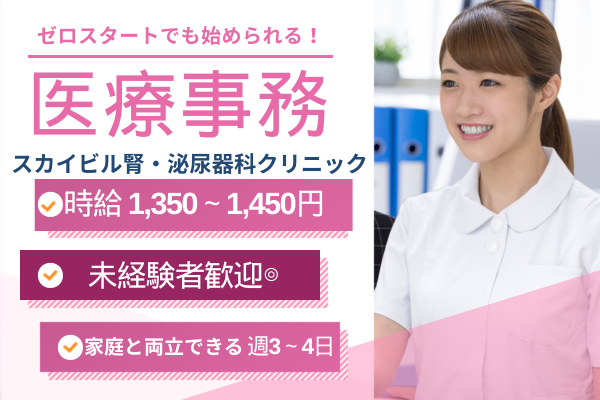 【スカイビル腎・泌尿器科クリニック】*\未経験・無資格からはじめる医療事務/*時給1,350円~1,450円|週3~4日勤務で子育て世代も活躍中!