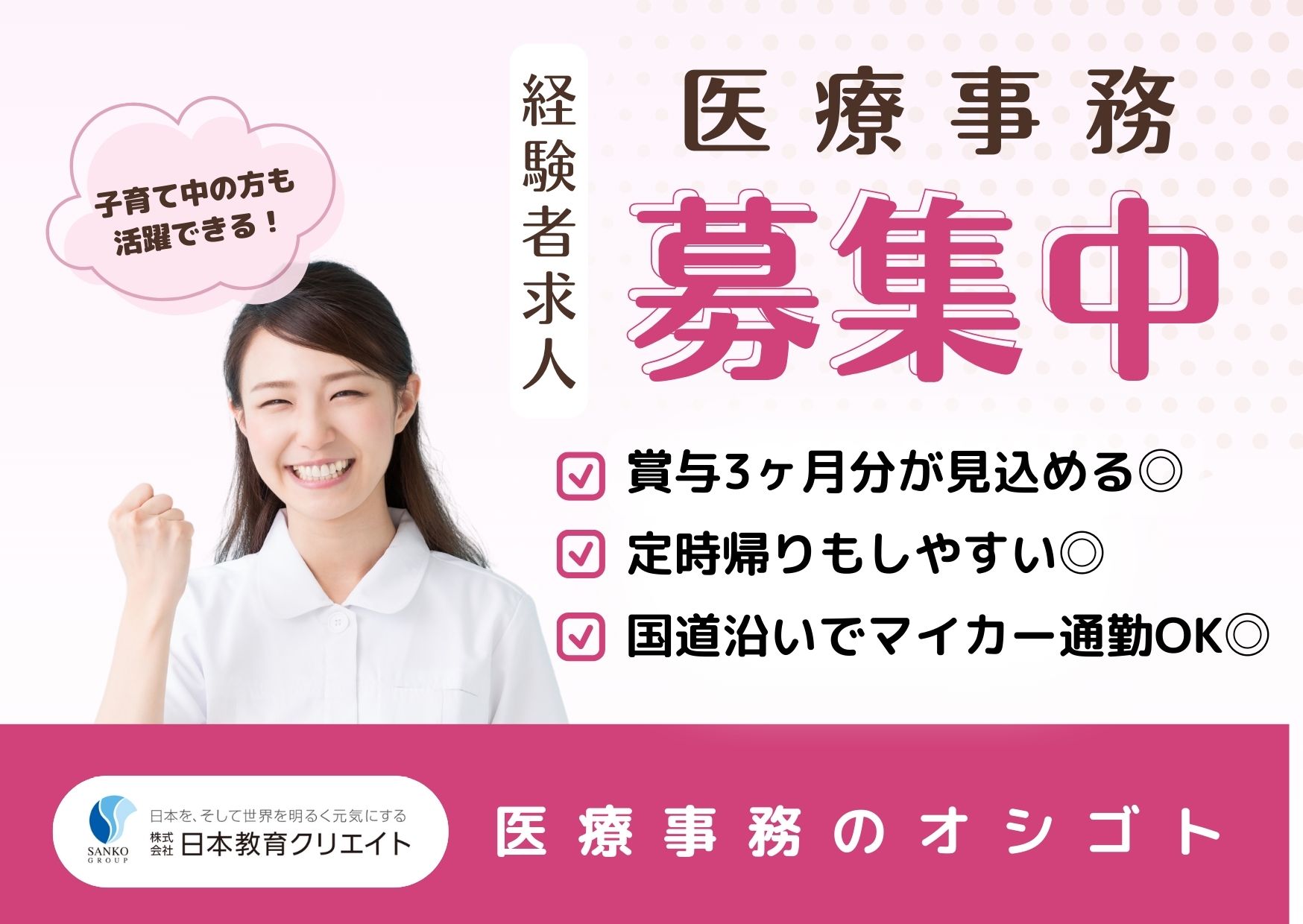 マイカー通勤しやすい・長期派遣ならではのサポート体制で安心・プライベートと両立OK・午後が忙しい方におススメ・未経験にもやさしいレセプト無しのお仕事・週2日でお休み取れる