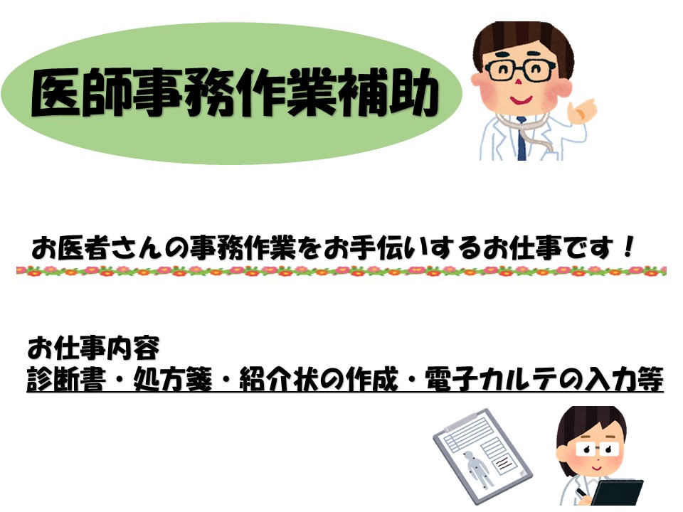 診察内容の記録や書類作成を通じて、医師の負担を軽くするお仕事です。