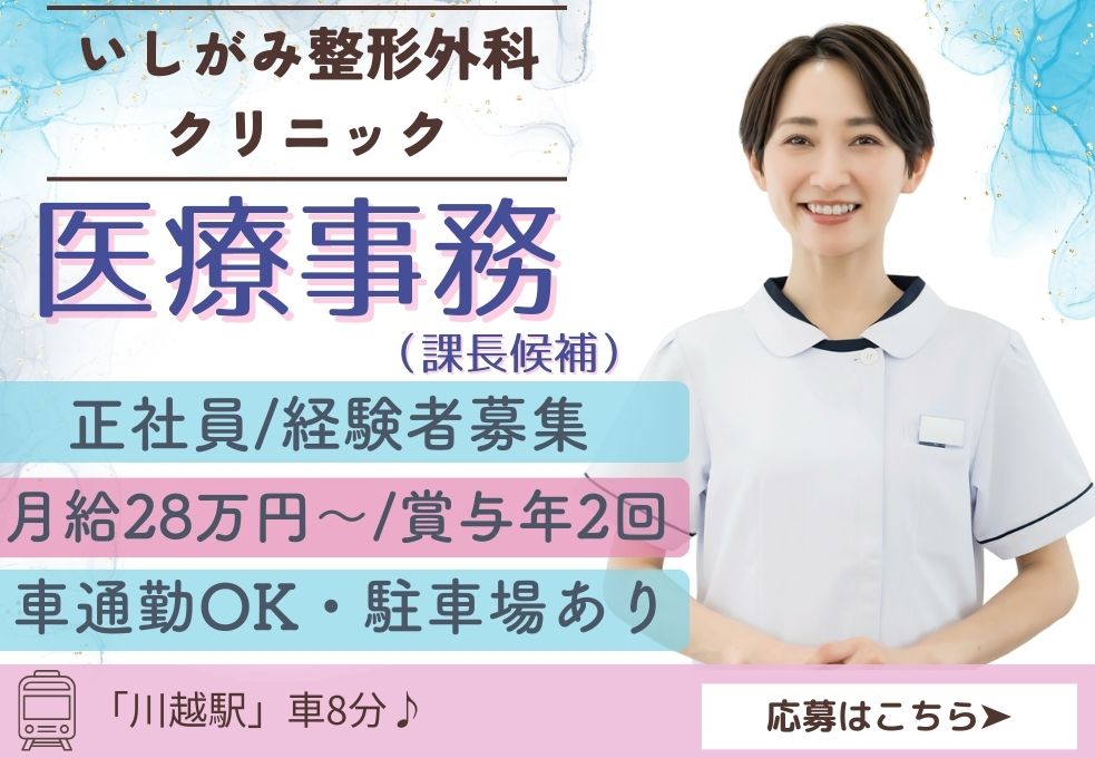 【川越・週休2.5日】整形外科クリニック×医療事務課長候補|マイカー通勤OK&多彩な福利厚生でプライベートも充実♪