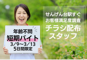 【学生~ミドル・シニアまで幅広く活躍中】3/9~3/15の5日間だけ*短期バイトでサクっと稼ごう!2名限定募集のためエントリーはお早めに☆彡