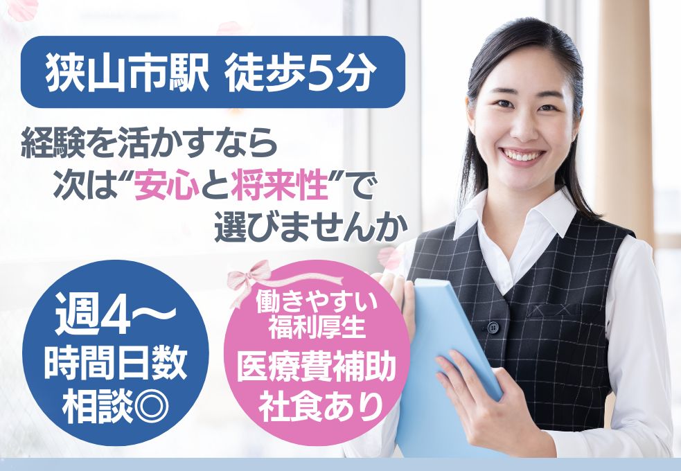 【狭山市駅徒歩5分】医療事務経験者歓迎★日祝休み&残業ほぼナシ!40〜50代活躍中*シフト相談OK♪