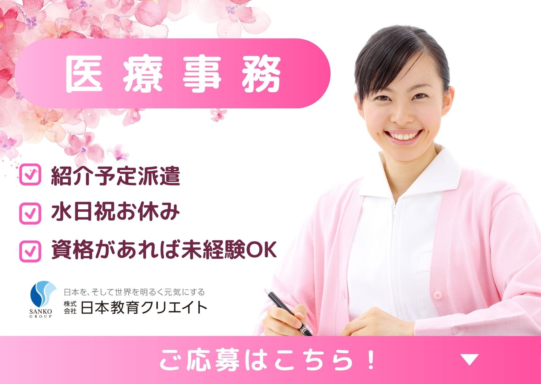訓練校で学んだ方や医療事務経験者の方も歓迎いたします。
