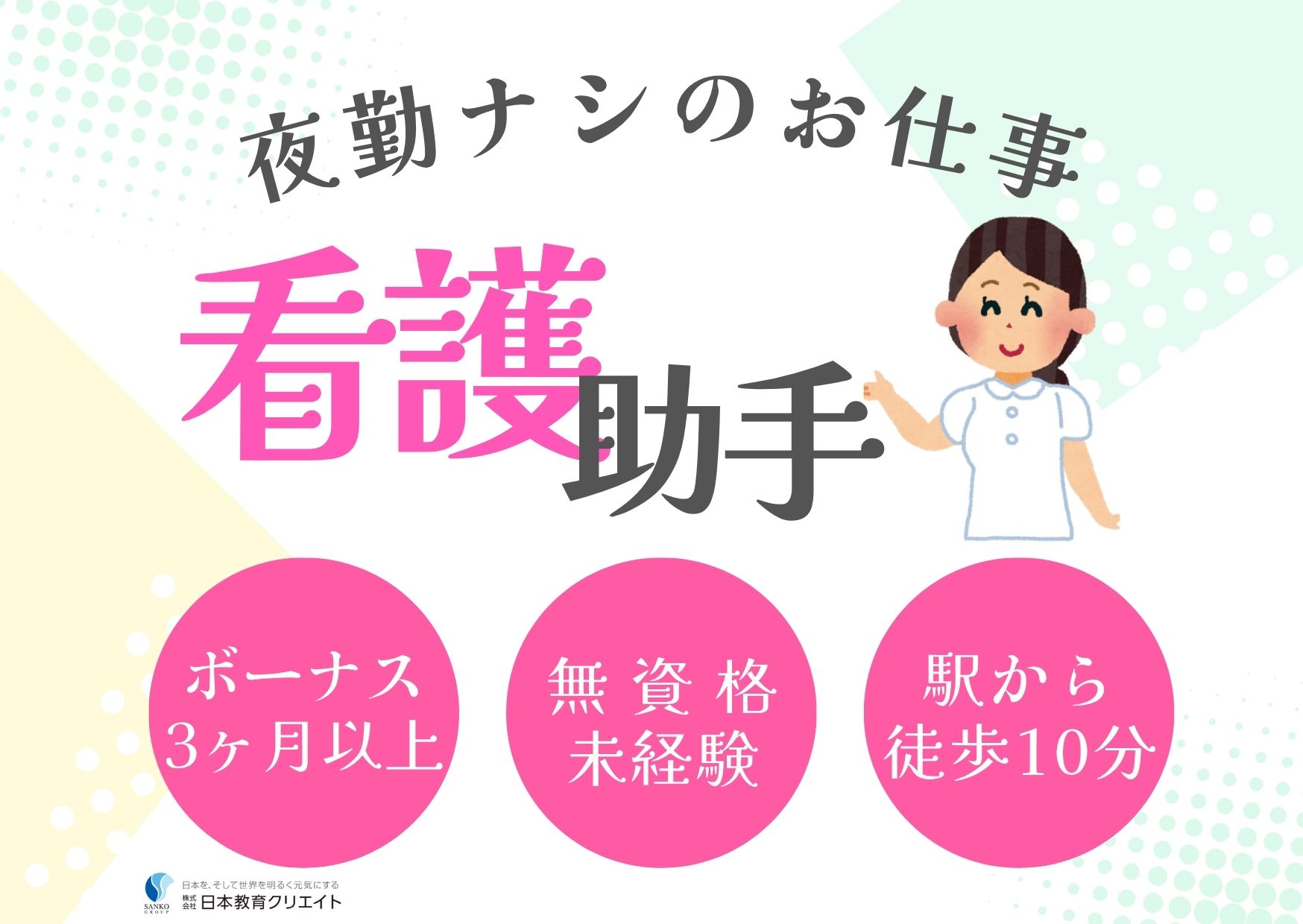 定時帰りしやすい・賞与があって安定収入・駅から徒歩圏内でアクセスラクラク・夜勤ナシで無理なく働ける・月9休みでプライベートと両立OK