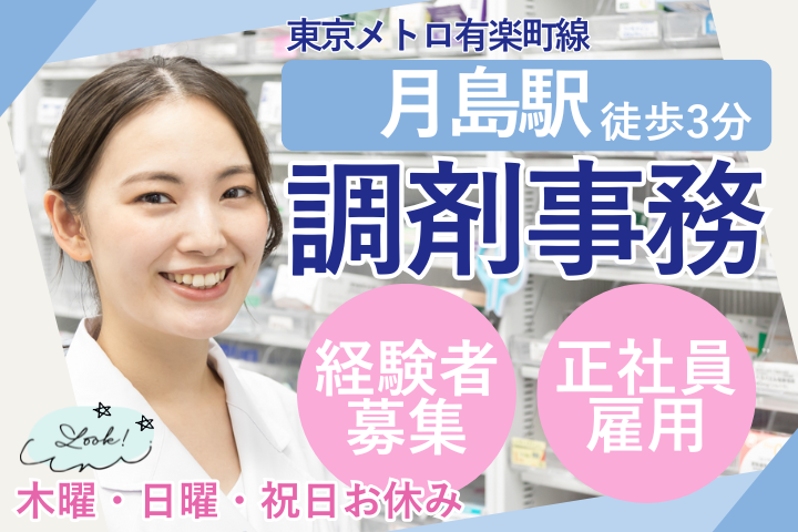 月島駅すぐ/経験者歓迎の調剤事務*週休2.5日&残業ほぼなし♪30代女性活躍中!