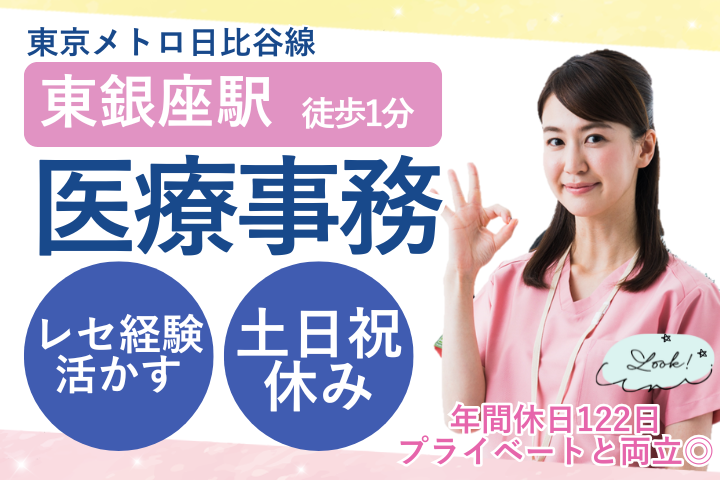 銀座のクリニックで医療事務*ワークライフバランス抜群!レセプト経験活かせる!土日祝休み