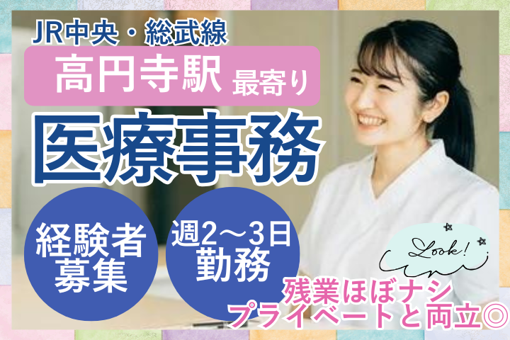 【高円寺駅から徒歩7分】経験を活かせる医療事務パート◎月曜土曜必須/週2~3日/扶養枠内OK/残業ほぼなし